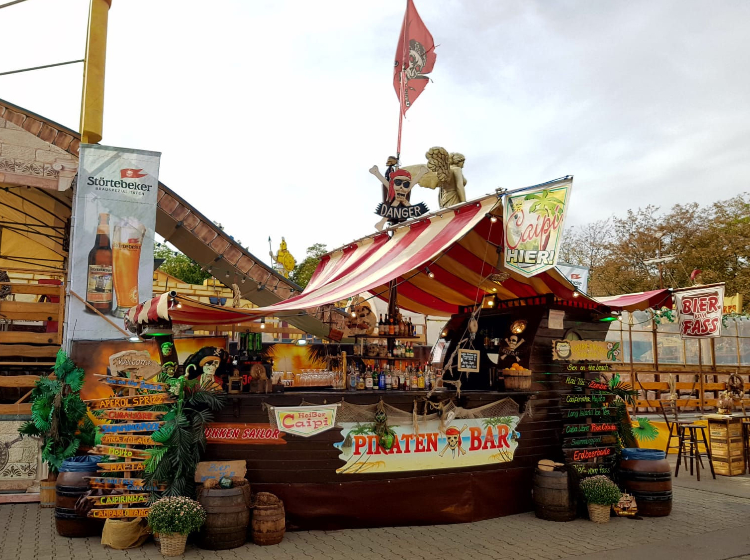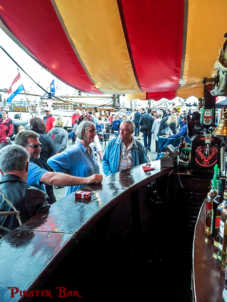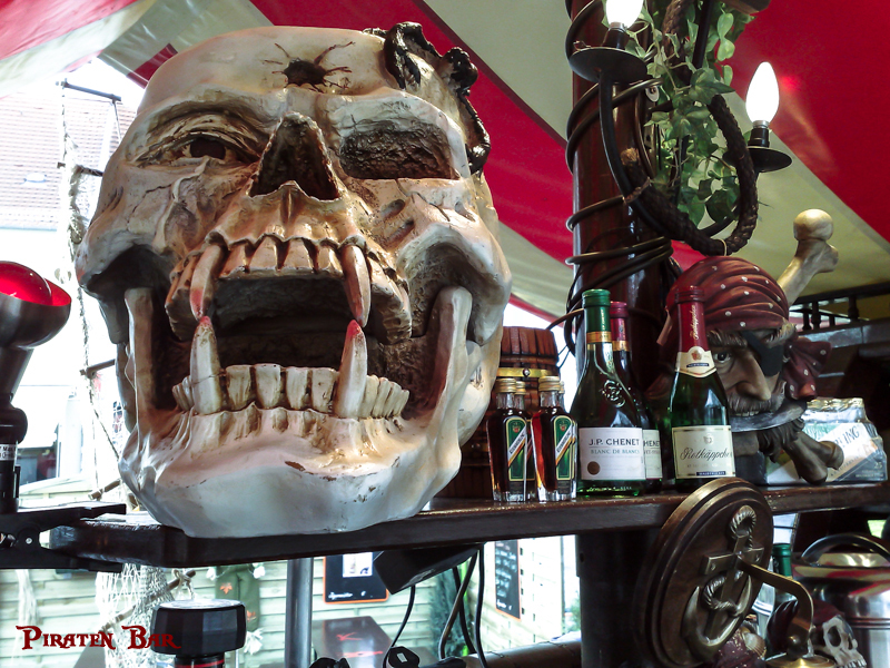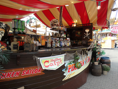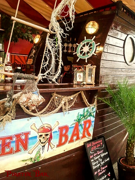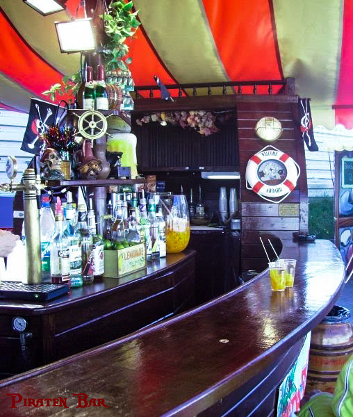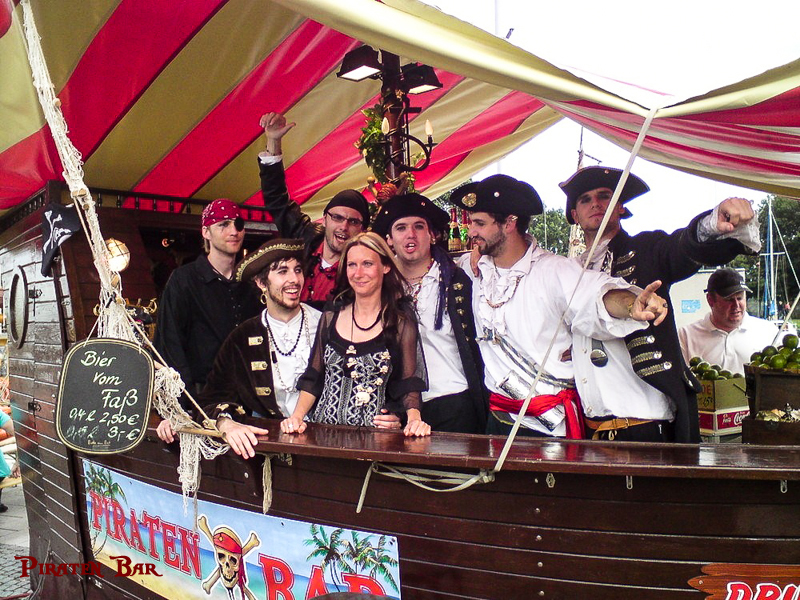 Unsere Piratenbar wurde nach original-historischem Vorbild einer Holzkogge in Echtholz erbaut. Viele Dekorationsteile im Piraten-Stil haben Platz an Bord gefunden und werden gern vom Publikum bestaunt. Unsere Akustik-Effekte lassen die Besucher den Wind in den Segeln spüren. Eine professionelle Piraten-Crew mixt für Sie Cocktails, serviert Longdrinks, Bowle, Wein und Sekt, sowie kühles Bier vom Fass. Zur kalten Jahreszeit gibt es Heißgetränke, wie Glühwein, Punsch und natürlich Grog, für echte Seemänner. Ihre Getränke können Sie am umlaufenden Boots-Tresen oder in unserem Biergarten genießen. Vergessen Sie für einen Moment den Alltag.